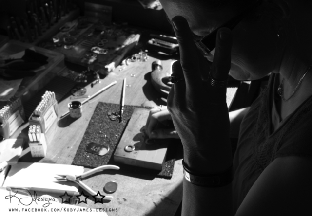 Handstamping means every letter, number, design stamp, is individually imprinted onto the metal using a hammer. This is a noisy job, and sometimes a painful job, I've hit my thumb more times than I like to remember.