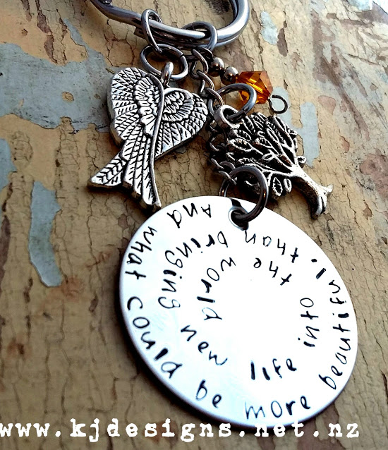 I came across KJdesigns website and had a browse till I saw the wedding key chains and thought that would be perfect. I'd found a quote I felt was fitting and Suz helped me chose the tree of life, representing the birth of our baby and angel wings representing the support she has been for me as well as a gem in her birthstone to personalise it further. I was so happy with the finished product that I'm ordering a keychain for my partners birthday as well.