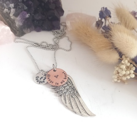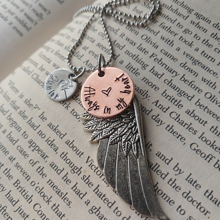 This is a beautiful memorial pendant that can be personalised for you. It features an angel wing, with a disc sitting on top of it 'always in my heart' is a popular choice, but you can choose words to suit.