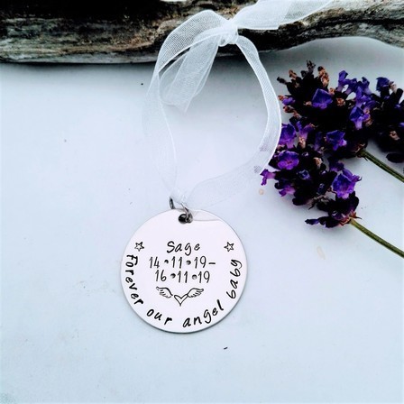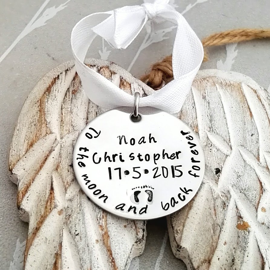 This can fit babies name, date of birth, a design stamp (ie wings, footprints, butterfly, dragonfly etc), and a quote around the outside.