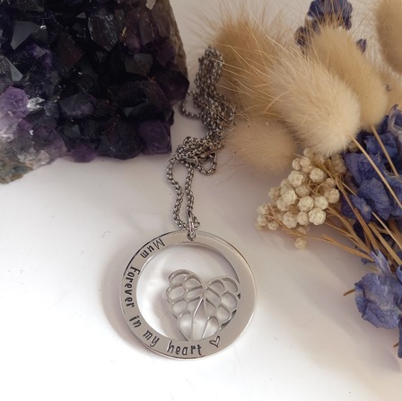 The centerpiece of this pendant showcases delicate angel wings nestled inside an outer ring, creating a heavenly and sentimental design.