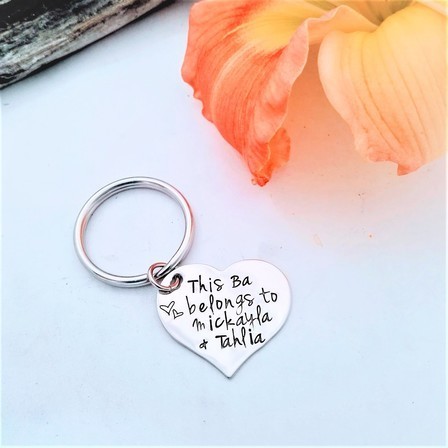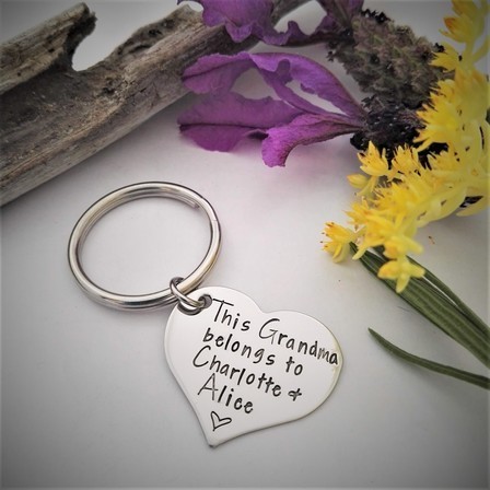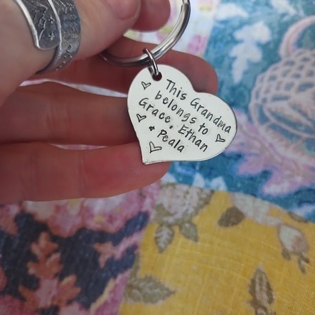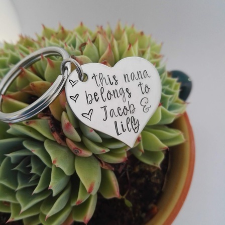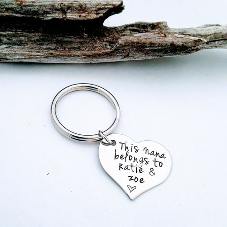 Gorgeous Keyring handstamped with "This nana belongs to .... " we can of course, do this Aunty, this Grandad, this Poppa, anything you would like... Choose from a 32mm Heart or a Round Disc.