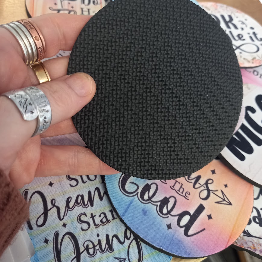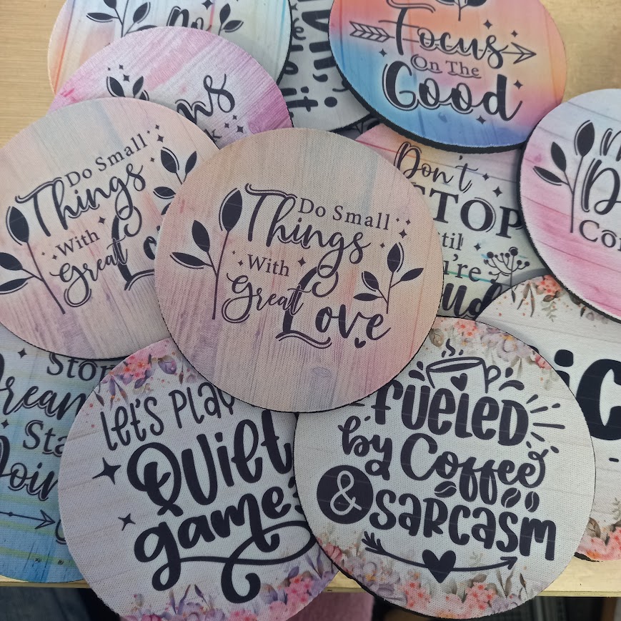 These coasters are designed for use in the car, they have a non-slip back and are sublimated by me with various quotes and sayings. They are pre-made and ready to courier to you. Fun for yourself, or as a gift for a family member or friend.