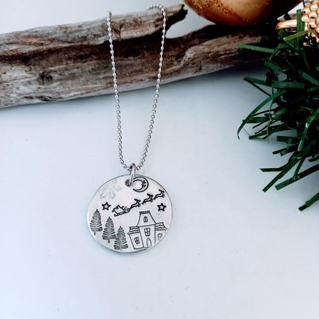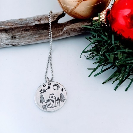 This handstamped Christmas necklace celebrates Santa's journey on Christmas Eve.