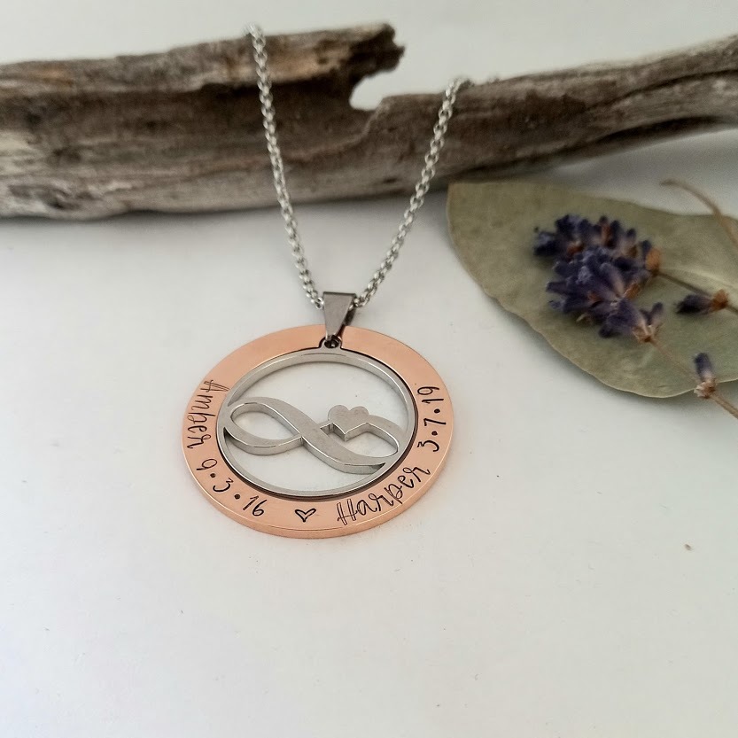 The outer ring can be hand-stamped with words or names of your choice, adding a touch of sentimentality to the design.