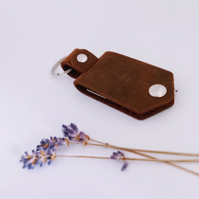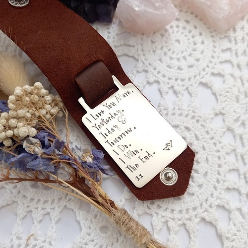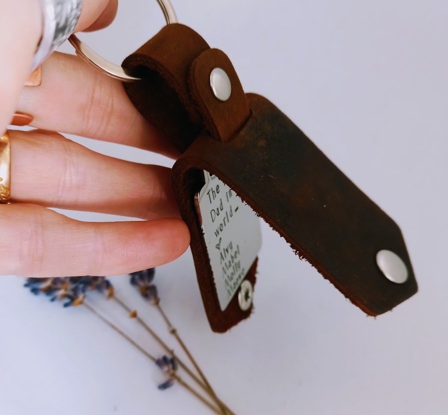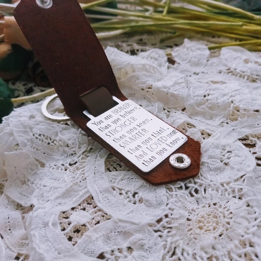 The beauty about this keyring is that the message is handstamped onto the stainless steel which is safely sandwiched between the leather.