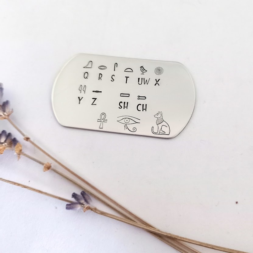 Hieroglyphs are a complex language, and while Egyptians didn't have an English alphabet, they used symbols that closely represented sounds. It's important to note that unless otherwise requested, we will stamp the direct "alphabet" version of the English words. For example, if you choose the name "Brayden" like the first name in the main image, we will select the corresponding symbols as depicted in the images.