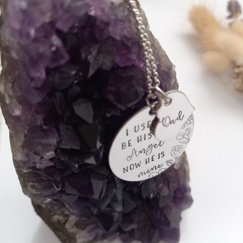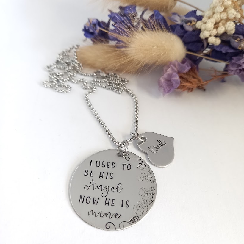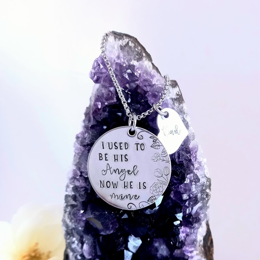 Handstamped with "I used to be his / her Angel now he / she is mine", with a little heart that is personalised with a name of your choice.