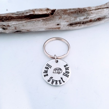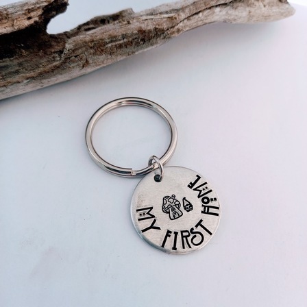 The pictured keyrings show "Home Sweet Home" (stamped with Bigelow Rules font), and "My First Home" (stamped with