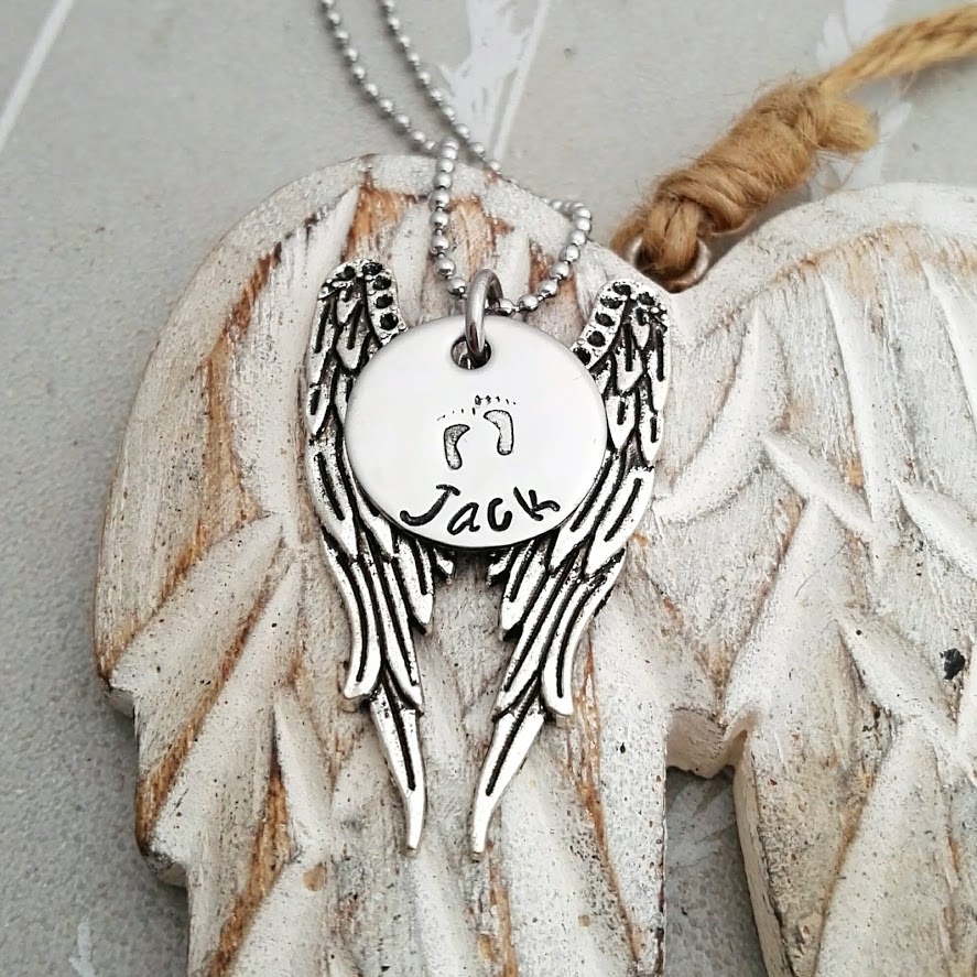 Sweet set of angel wings, with a little disc with baby footprints on it.