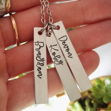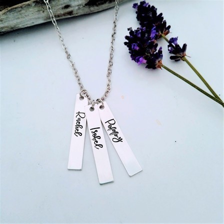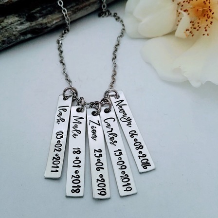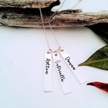 This personalised pendant features vertical hand-stamped tags that are full of elegance and sentimentality.