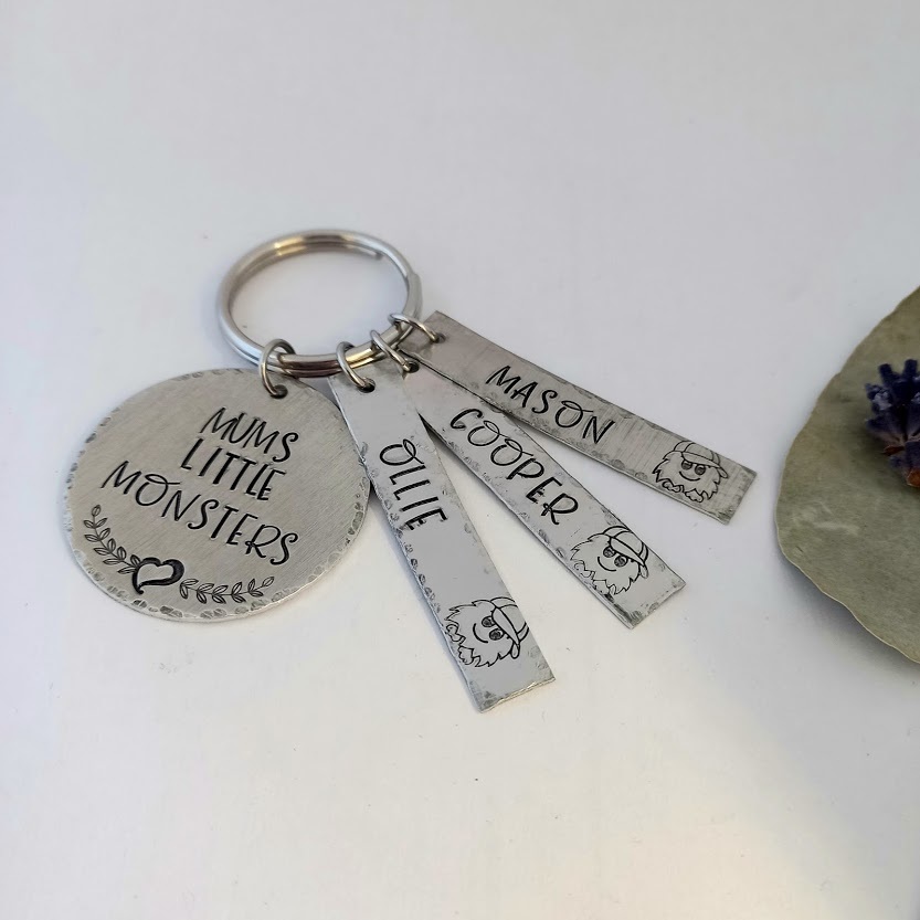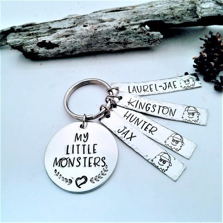 These are handstamped by us, so can say "Mums little Monsters", "Dads little Monsters", "Nanas little Monsters", "Jacks little Monsters" etc etc, and each tag has a name and a boy or girl monster on it !
