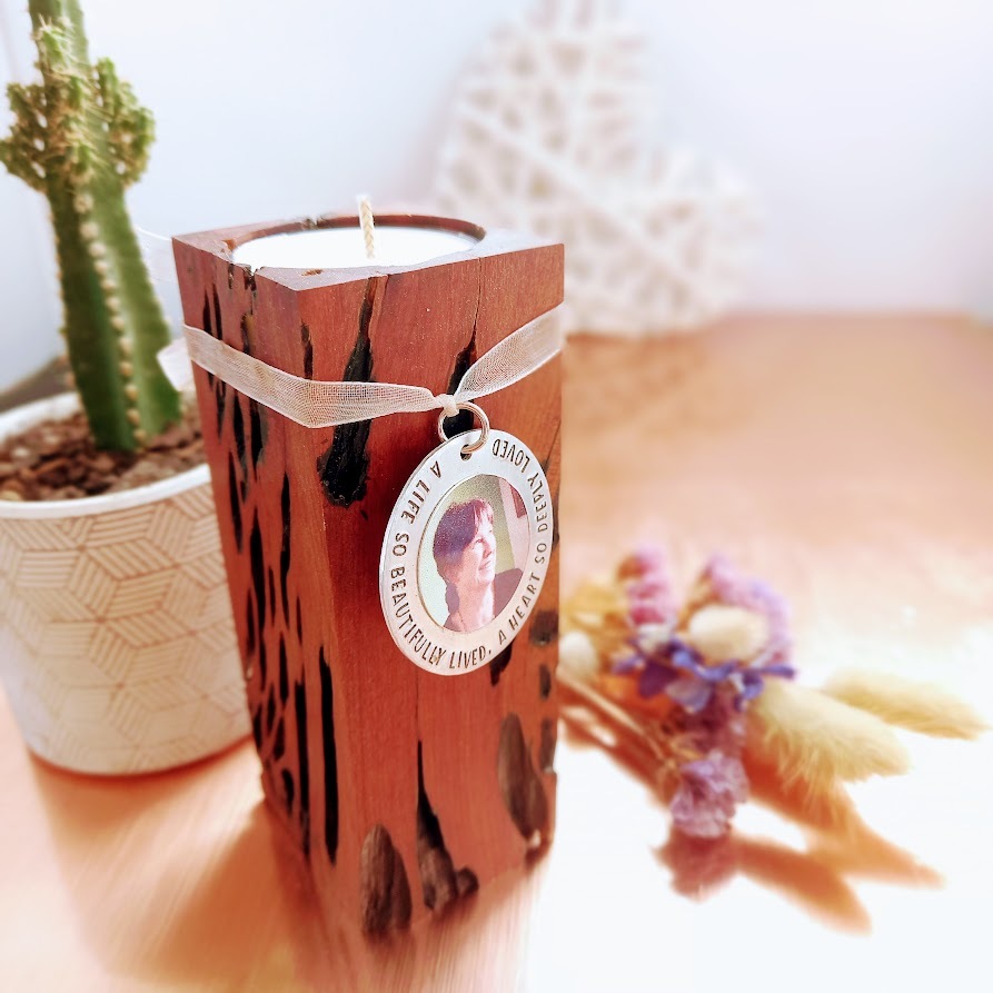 The Tealight Pillar stands 12cm high, with the personalised disc being 38mm in diameter. These will come with a tealight candle so it is ready to use / gift.