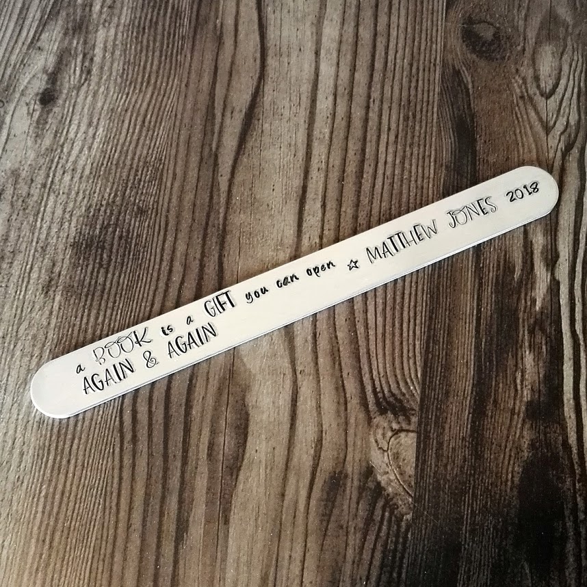 Gorgeous Aluminium 15cm long bookmark .. handstamped with a quote, words, names of your choice.
