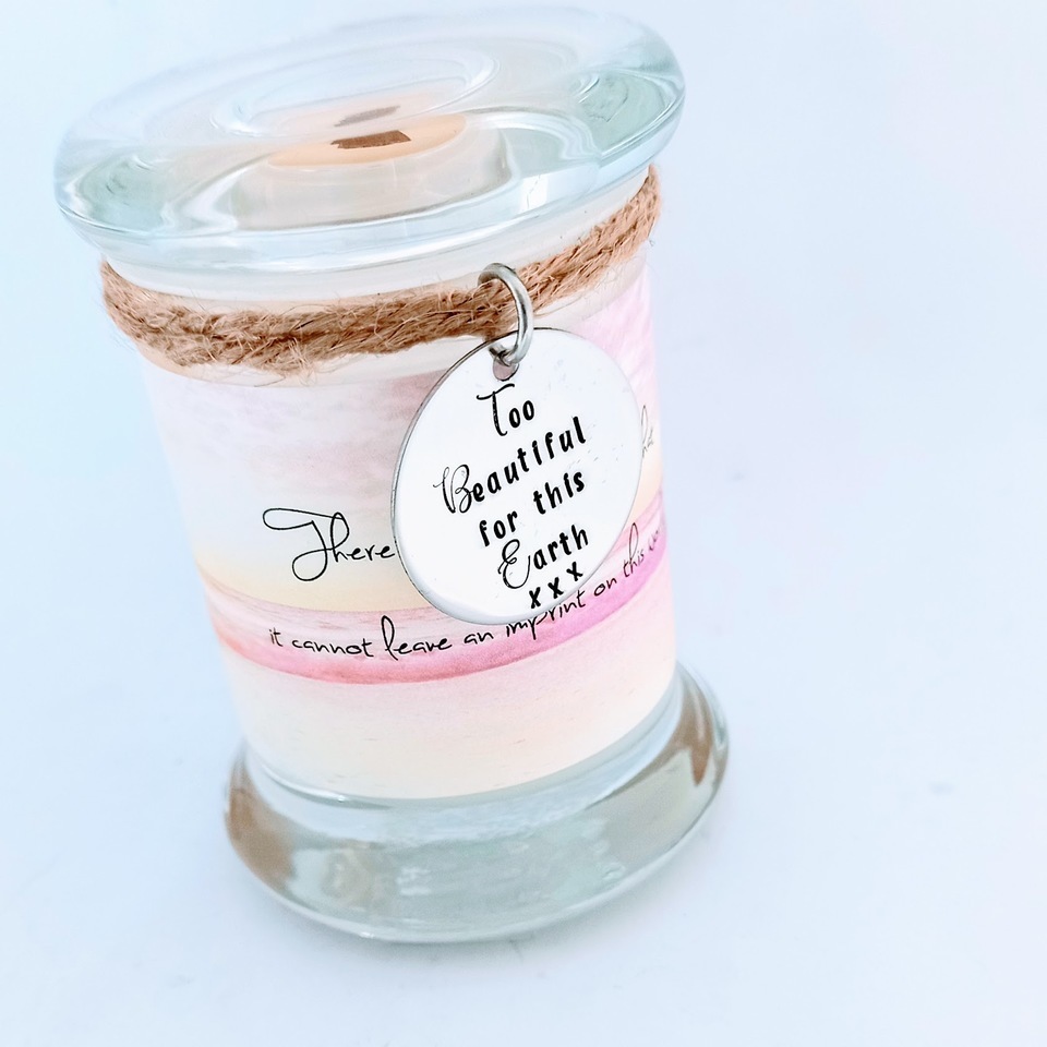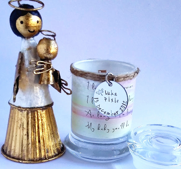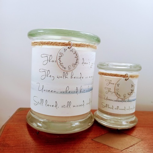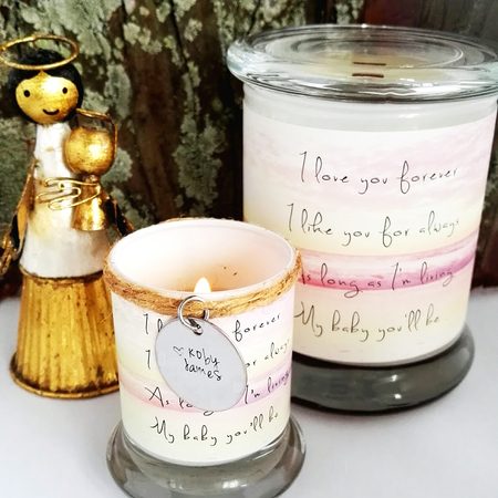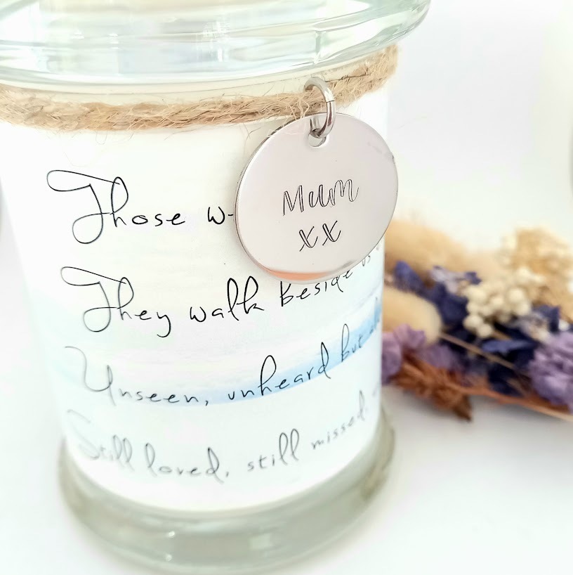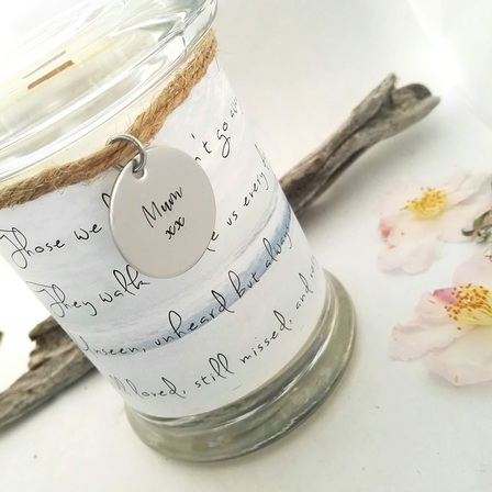 These beautiful candles also include a handstamped disc - which can be personalised with your loved ones details.