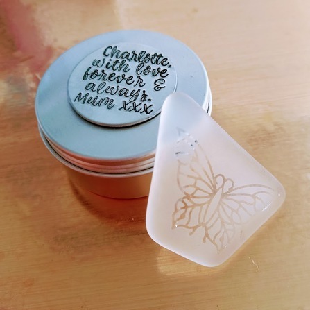 The Memory Stone is kiln fired glass, they are lovely organic shapes - no two are the same, they feature a beautiful butterfly image sand blasted into the glass.