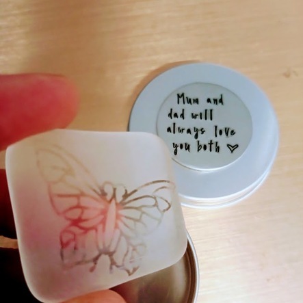It comes in one of our little Keepsake Tins - these have a personalised disc - which can have any words you'd like.