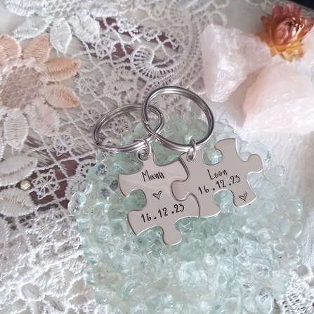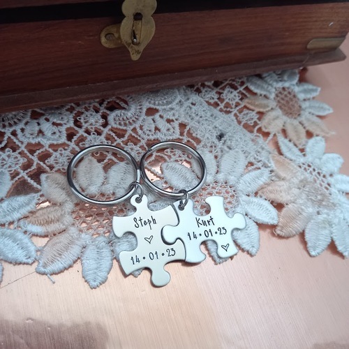 Cute set of 2 puzzle piece keyrings that fit together .. stamped to say :