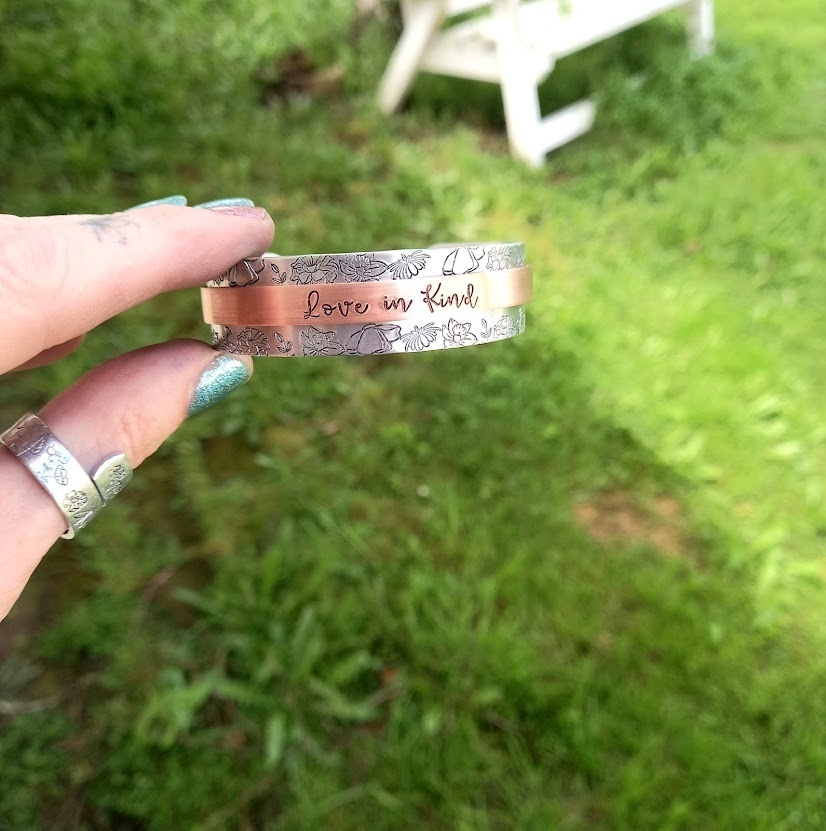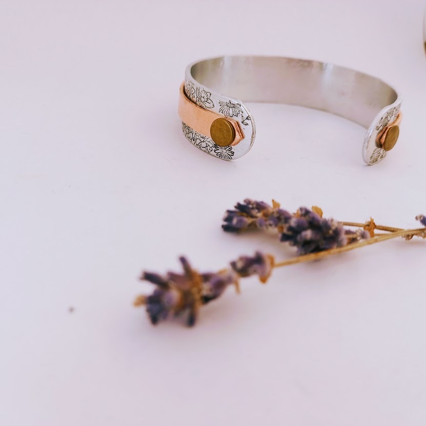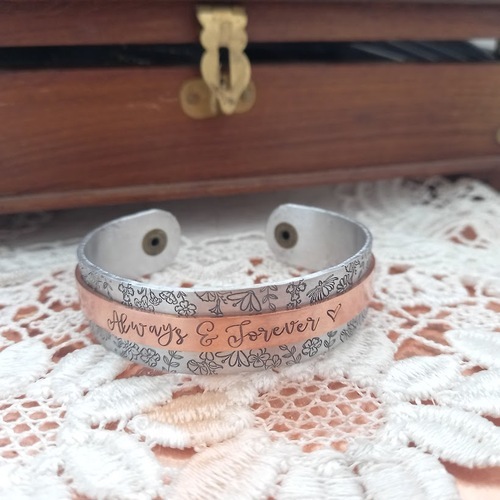 It is made from 2 pieces of metal, rivetted together. The Aluminium (15mm wide) is hand stamped with a floral design (or something else - you have have a look at the available design stamps here), and the thinner copper piece will hold words of your choice.