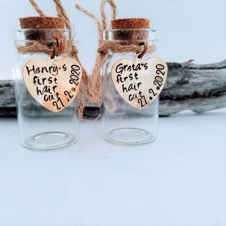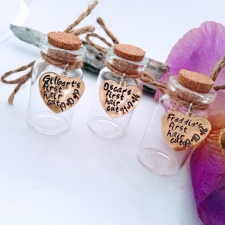 Cute little glass jar (4cm x 2cm) with a brass heart - personalised with babies/childs name.