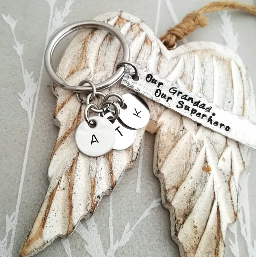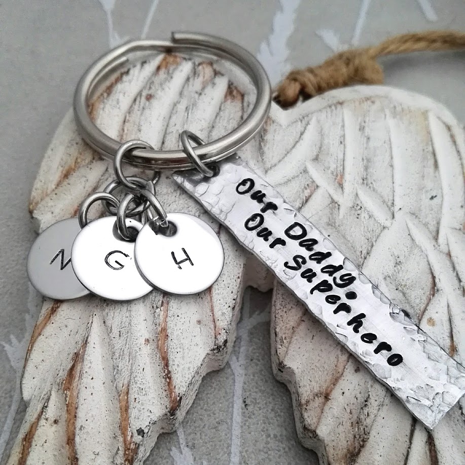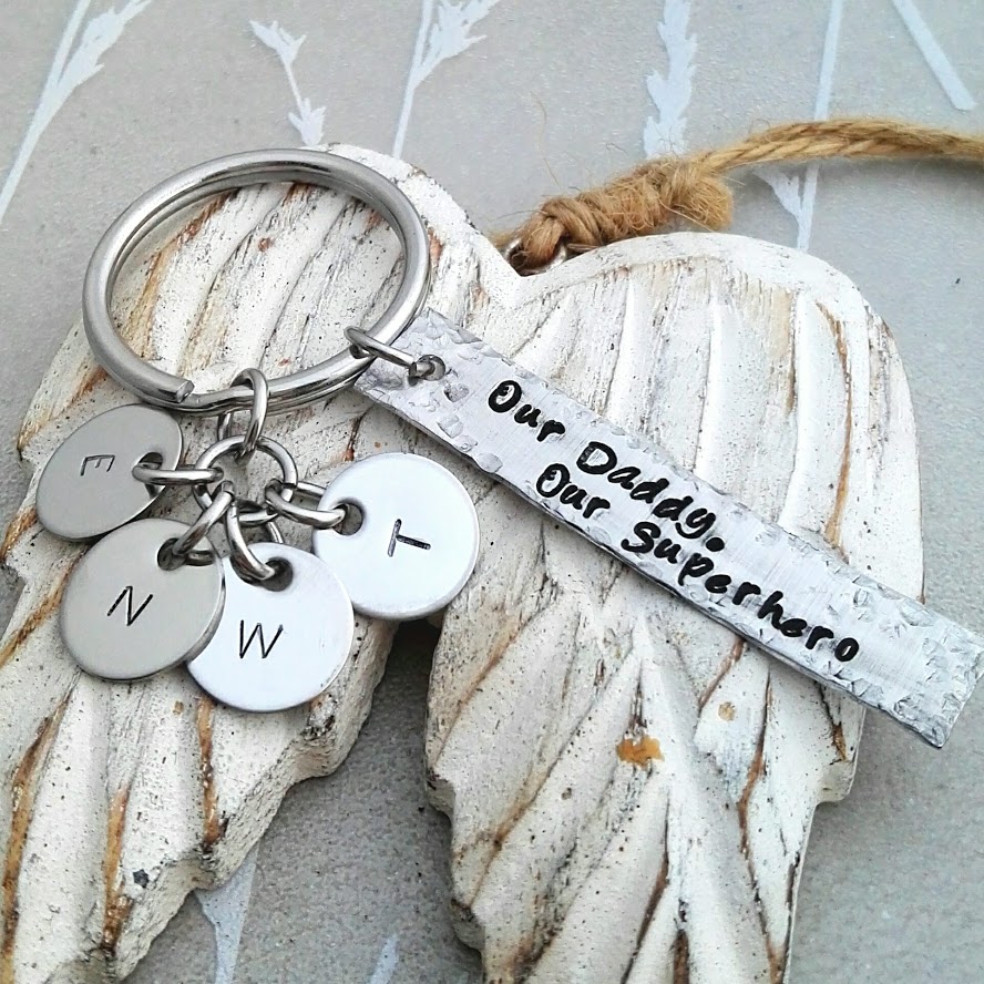 "Our Daddy, Our Superhero" or a similar length saying, teamed with the kids names on disc's is the perfect idea for this keyring.
