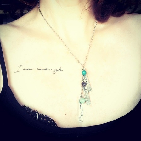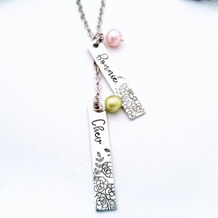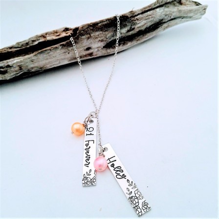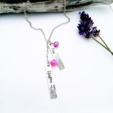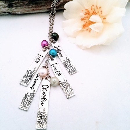 Featuring hand-stamped personalised tags, this pendant allows you to carry the names of your cherished family members or loved ones close to your heart. The tags are complemented by a delicate floral design at the base, adding an elegant touch to the pendant.