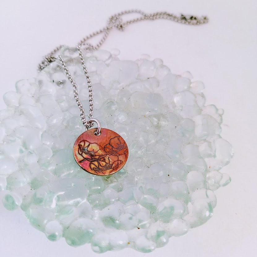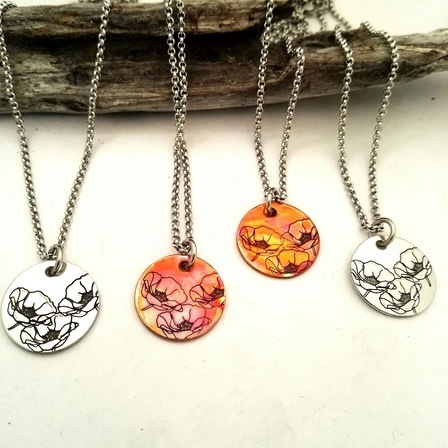 Give the everlasting gift of flowers with our exquisite Poppy Disc Pendant. The delicate poppies are expertly hand-stamped into the metal, creating a timeless piece that will always bring a smile.