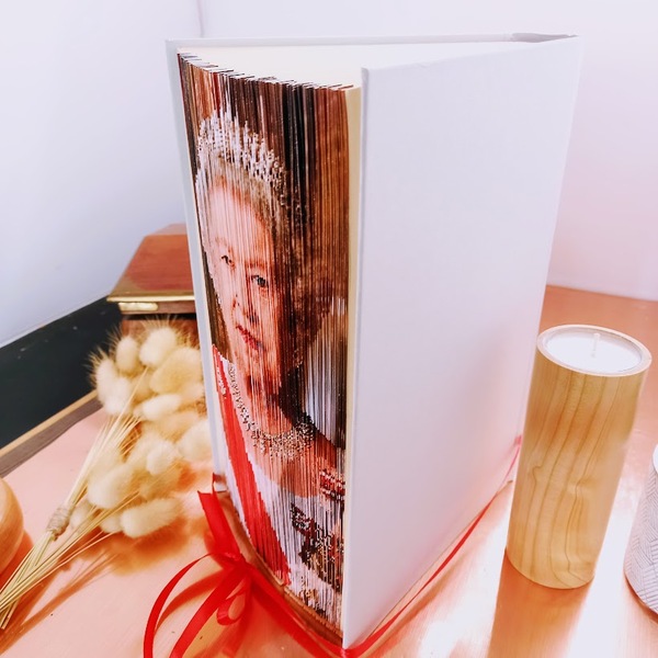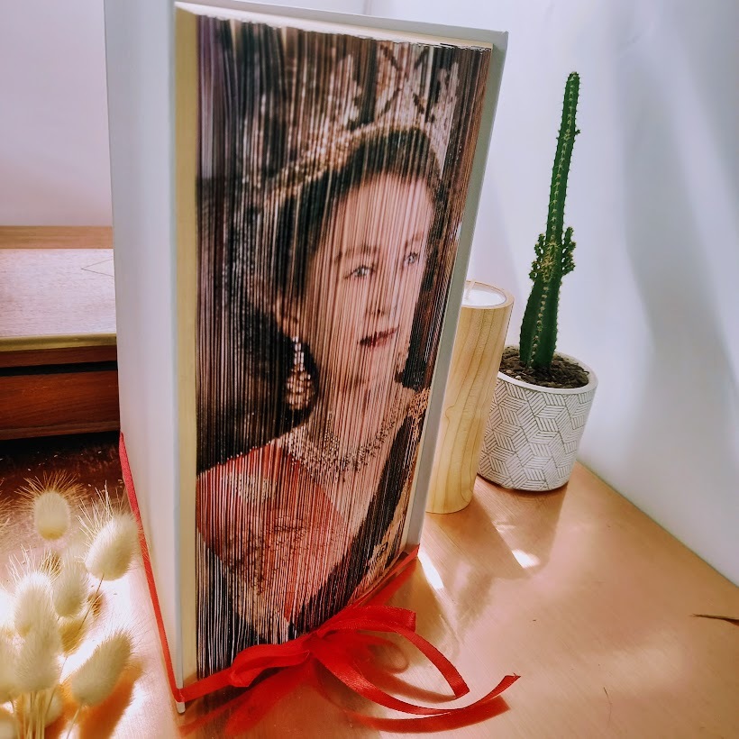 Created from an upcycled book, view from one side and you'll see a young Queen and from the other you'll see her towards the end of her 70 year reign.