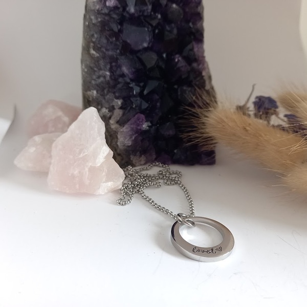 These are ION plated stainless steel, and come on a stainless steel rolo chain (51cm). The ring is 22mm in diameter.