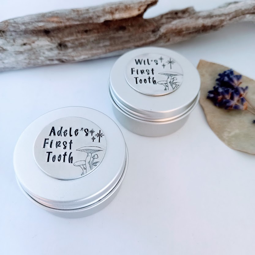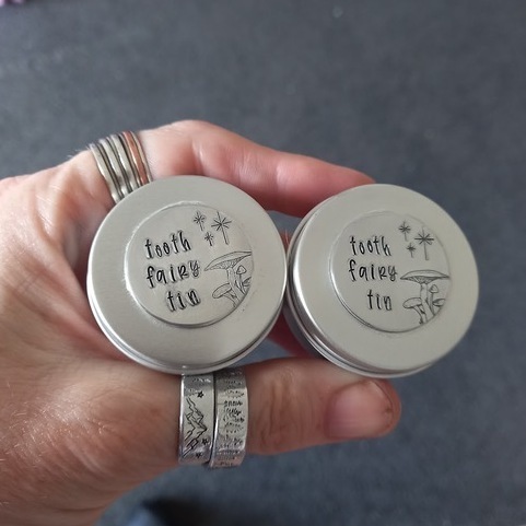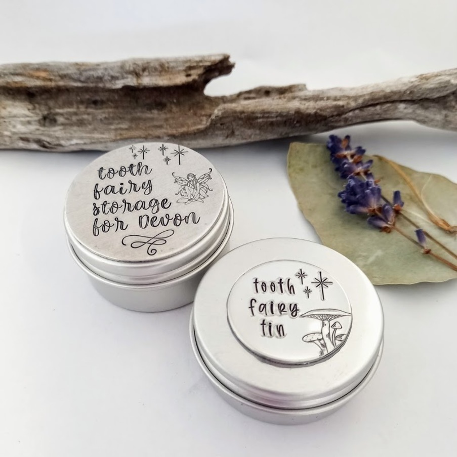 Hand stamped with "Tooth Fairy Tin" - we can add a name ie "Devon's Tooth Fairy Tin" if you'd like.