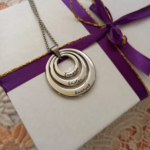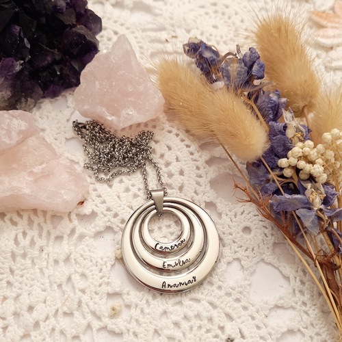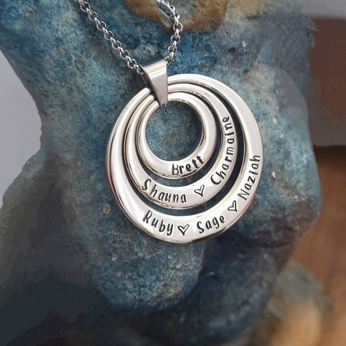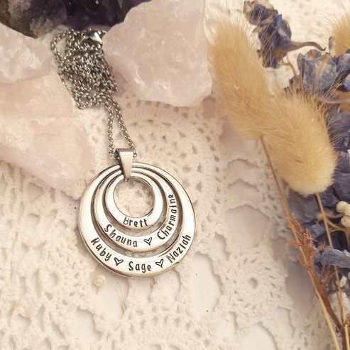 This pendant showcases three luxurious rings crafted from thick stainless steel, symbolising the unbreakable bond and connection between loved ones. Personalised to perfection, each ring can be handstamped with names or words of your choice, allowing you to create a unique and heartfelt piece that represents the cherished individuals in your life.